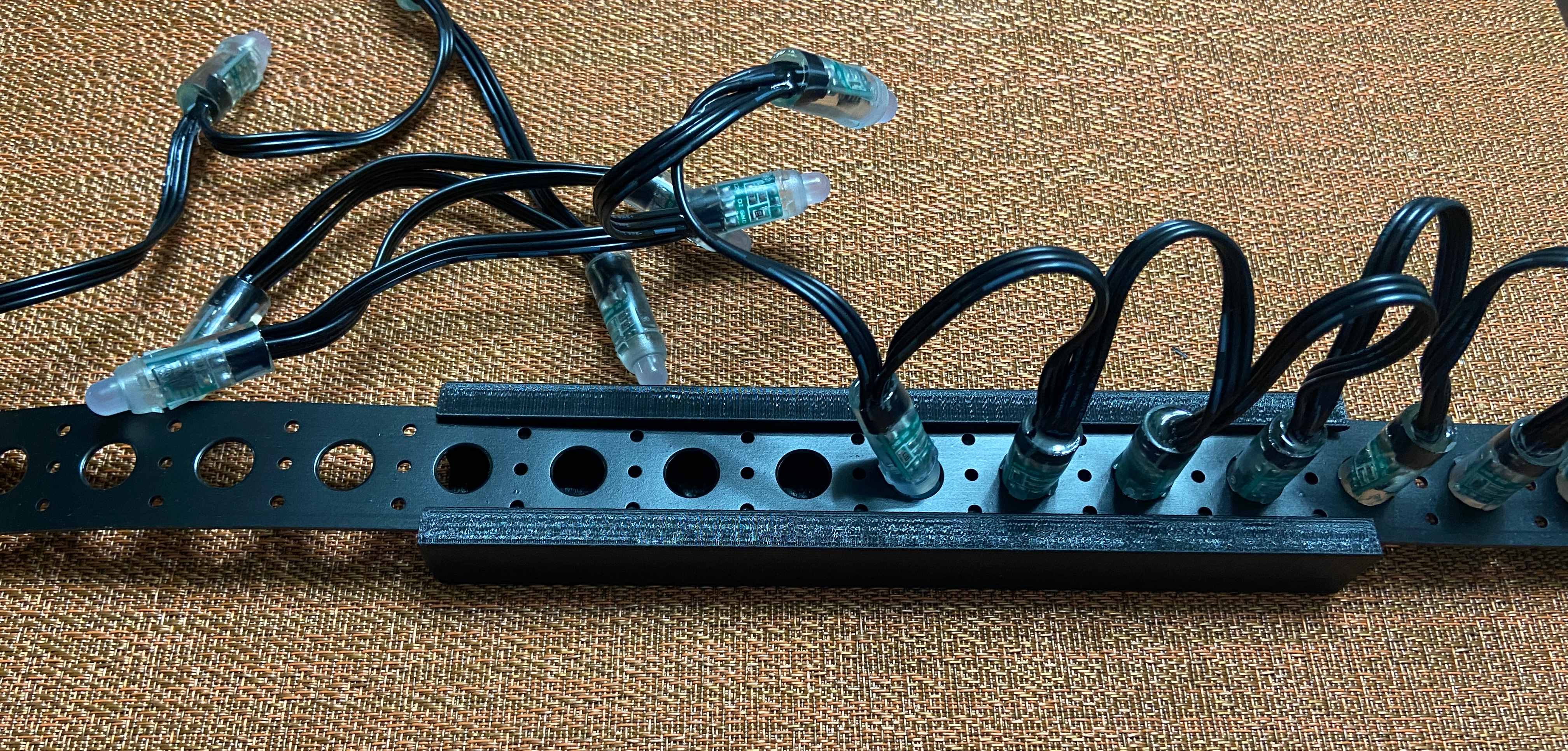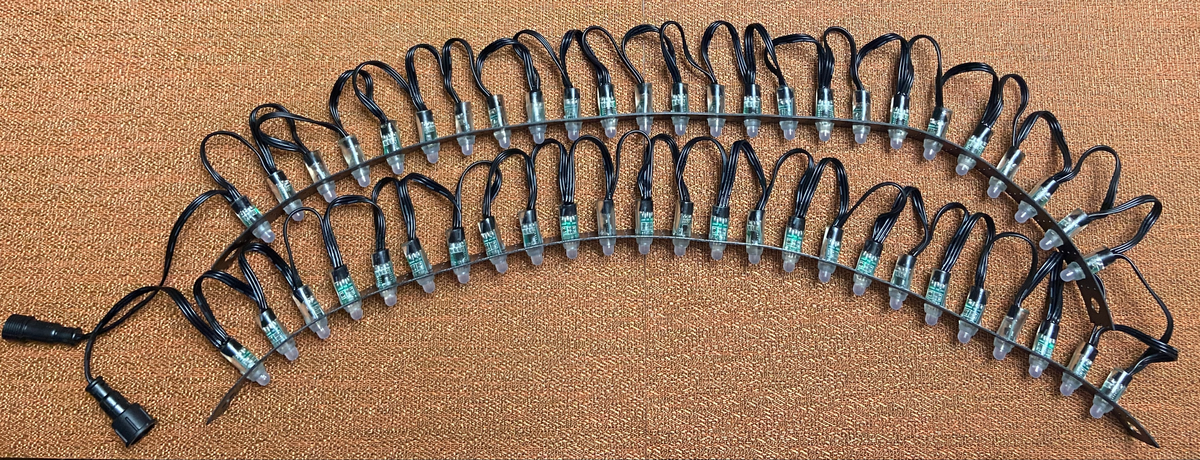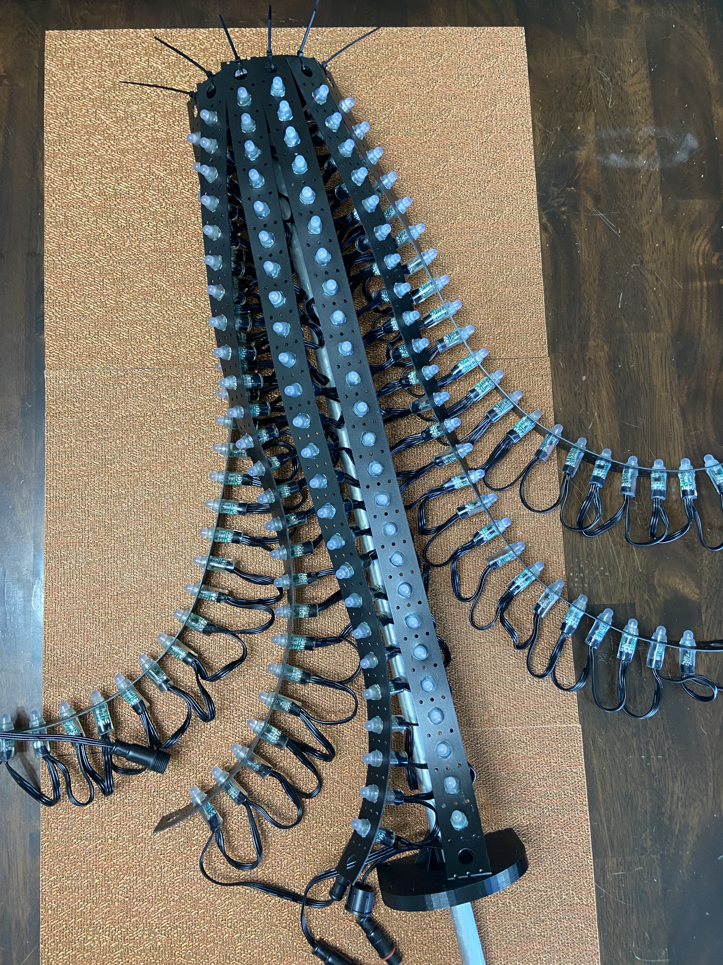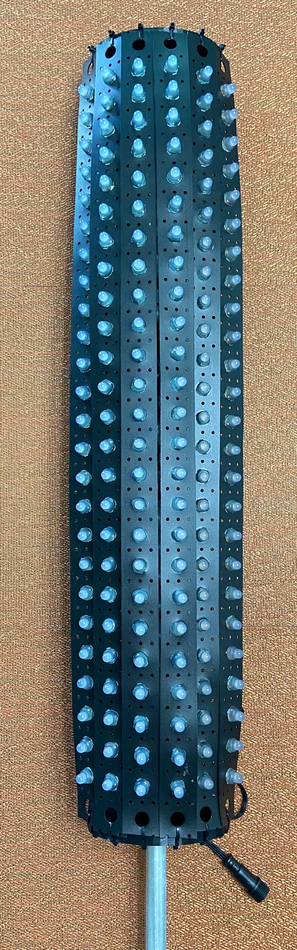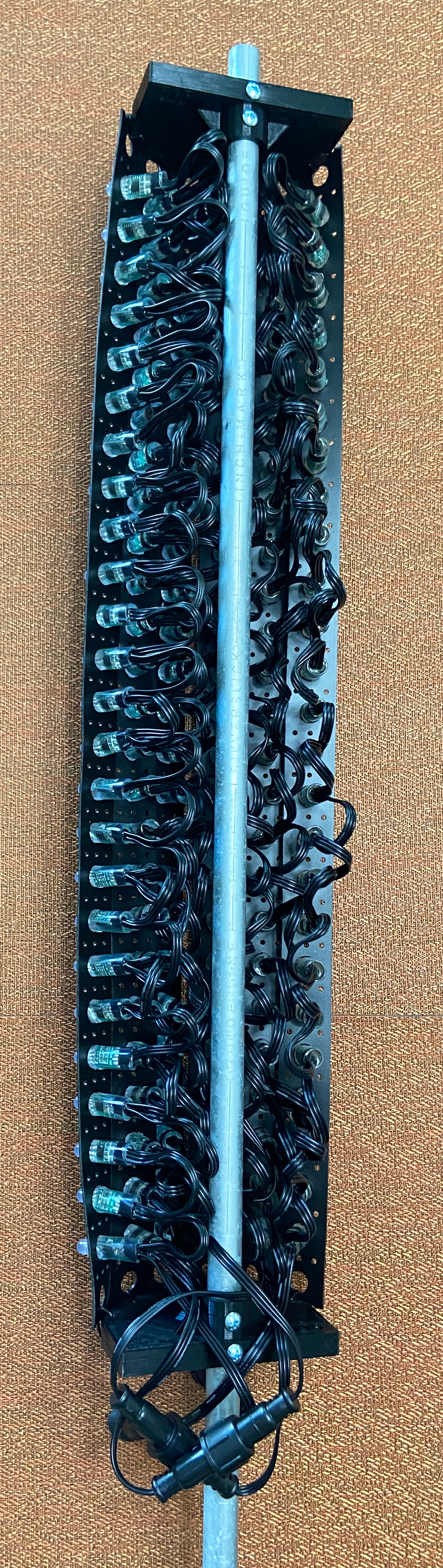 The pixel poles are constructed with a 1/2″ inch EMT spine at 4′ long and two 3D printed ends. Each end can hold 6 strips of your desired length.