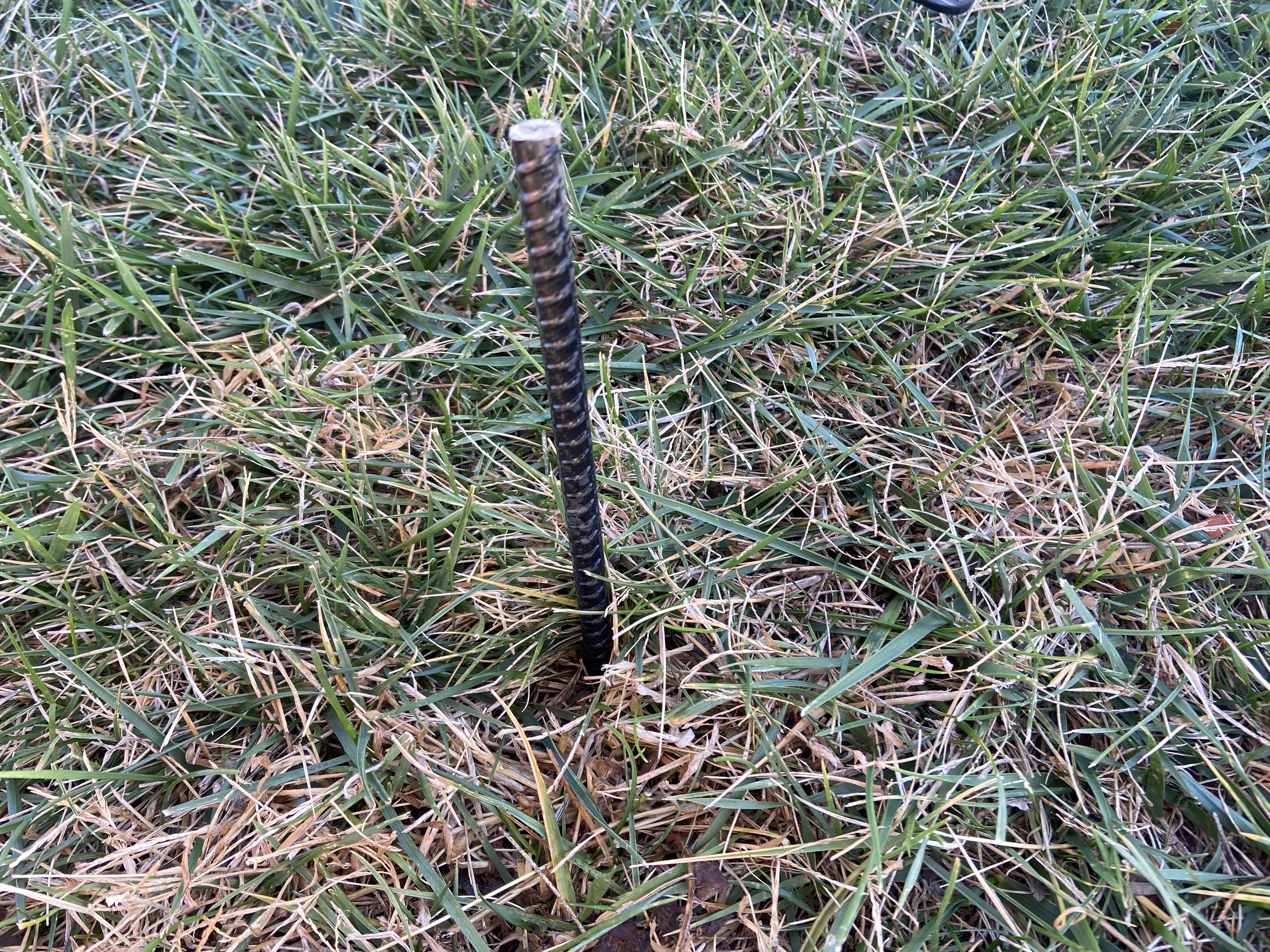 A 16″ rebar is driven into the ground and the pole is placed over the rebar anchor. I usually hammer the pole into the ground a bit to give it stability.