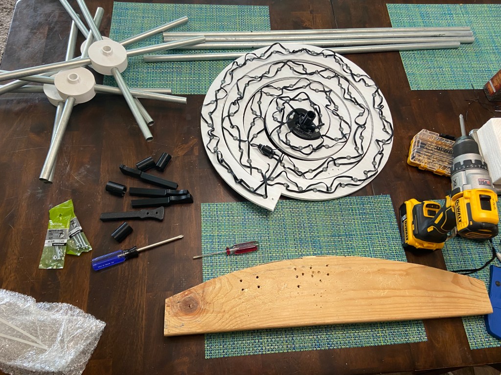 The frames are built using a 32″ center pole of EMT conduit with 3D printed top, bottom hub, and supporting arm using the design from InspireLightShows.com. The four legs are 10″ long. They will be anchored with a single rebar stake which passes through the hub and into the center pole.